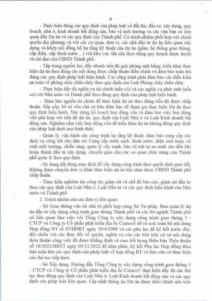 – Sở Giao thông vận tải chủ trì phối hợp cùng Sở Tư pháp, Ban quản lý dự án đầu tư xây dựng công trình giao thông Thành phố và các Sở ngành Thành phố có liên quan làm việc với Tổng Công ty xây dựng công trình giao thông 5 CTCP và Công ty Cổ phần phát triển địa ốc Cienco5 để rà soát toàn bộ nội dung Hợp đồng BT số 02/HĐBT ngày 18/4/2008 và các phụ lục đã ký kết trước đây, đối chiếu với các thay đổi về quyền, nghĩa vụ của các bên trên cơ sở nội dung thỏa thuận công việc đã được khẳng định và cam kết trong Biên bản Thỏa thuận số 18/2022/BBTT ngày 09/11/2022 để đàm phán, ký kết Phụ lục Hợp đồng đảm bảo tuân thủ các quy định của pháp luật về hợp đồng BT và làm căn cứ thực hiện các thủ tục tiếp theo.
